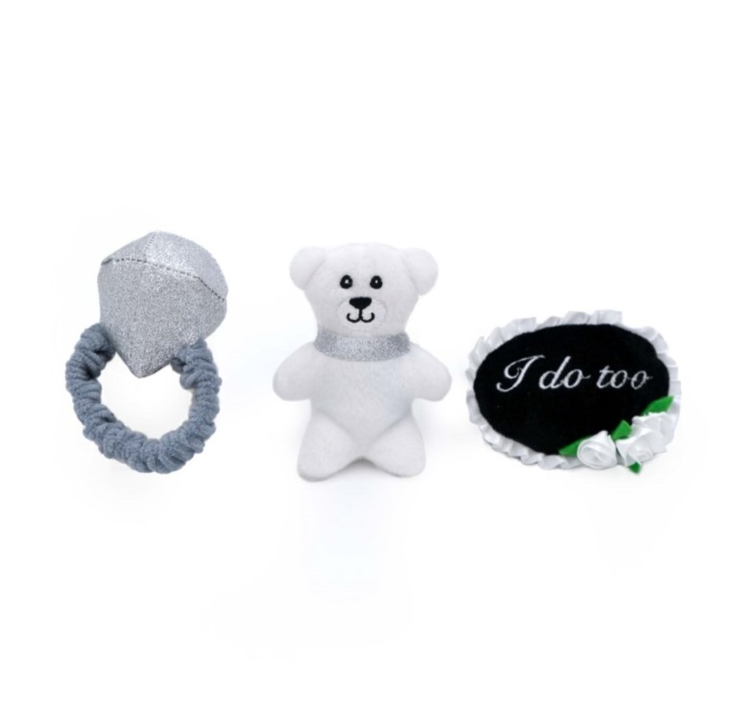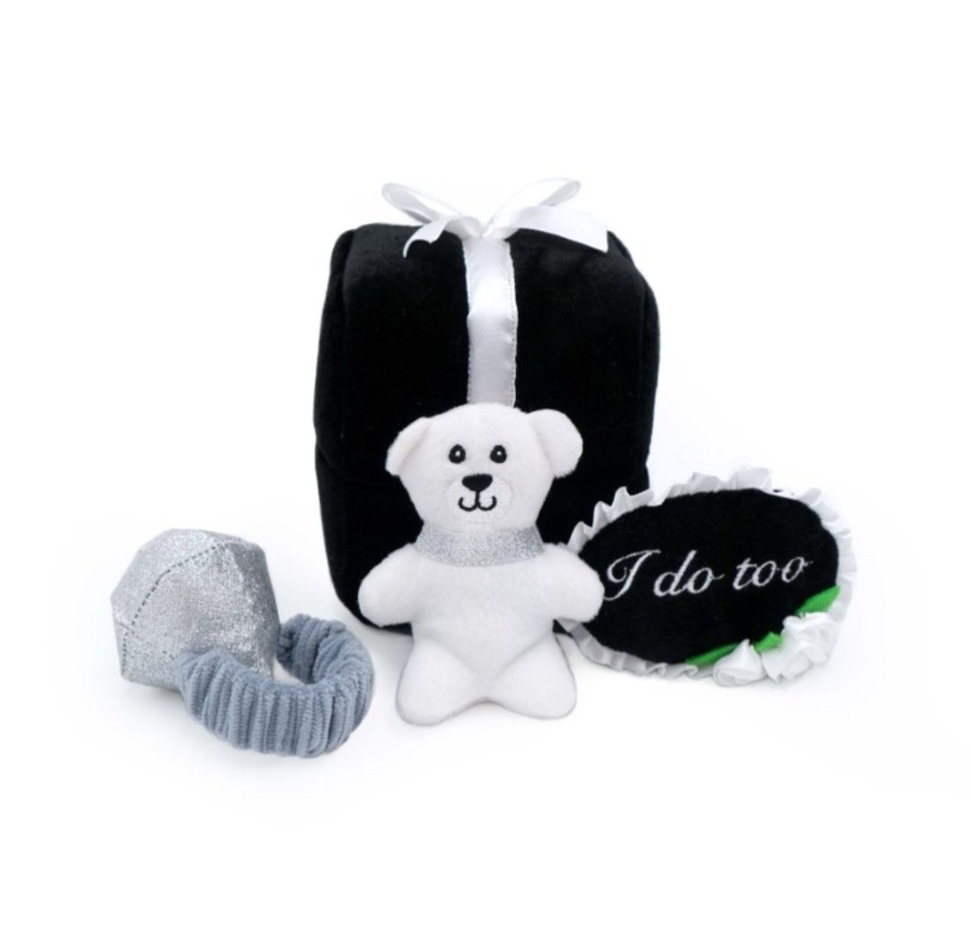 Het perfecte cadeau voor de hond die zegt „Ik ook”, het is de Zippy Burrow™ trouwringdoos! Stop het drietal Miniz met bruiloftsthema in de doos en leun achterover en kijk toe hoe je hond werkt om ze allemaal te pakken te krijgen. Zodra je pup al het piepende speelgoed tevoorschijn heeft, zullen ze je smeken om het steeds weer in te steken voor urenlang speelplezier!